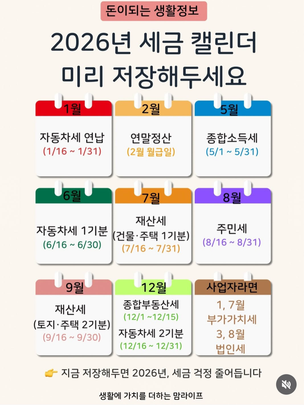오늘은 깜빡하면 가산세를 물거나 할인을 놓칠 수 있는 **<2026년 필수 세금 캘린더>**를 정리해 드립니다. 당장 1월에 챙겨야 할 중요한 혜택이 있으니 꼭 확인하세요!